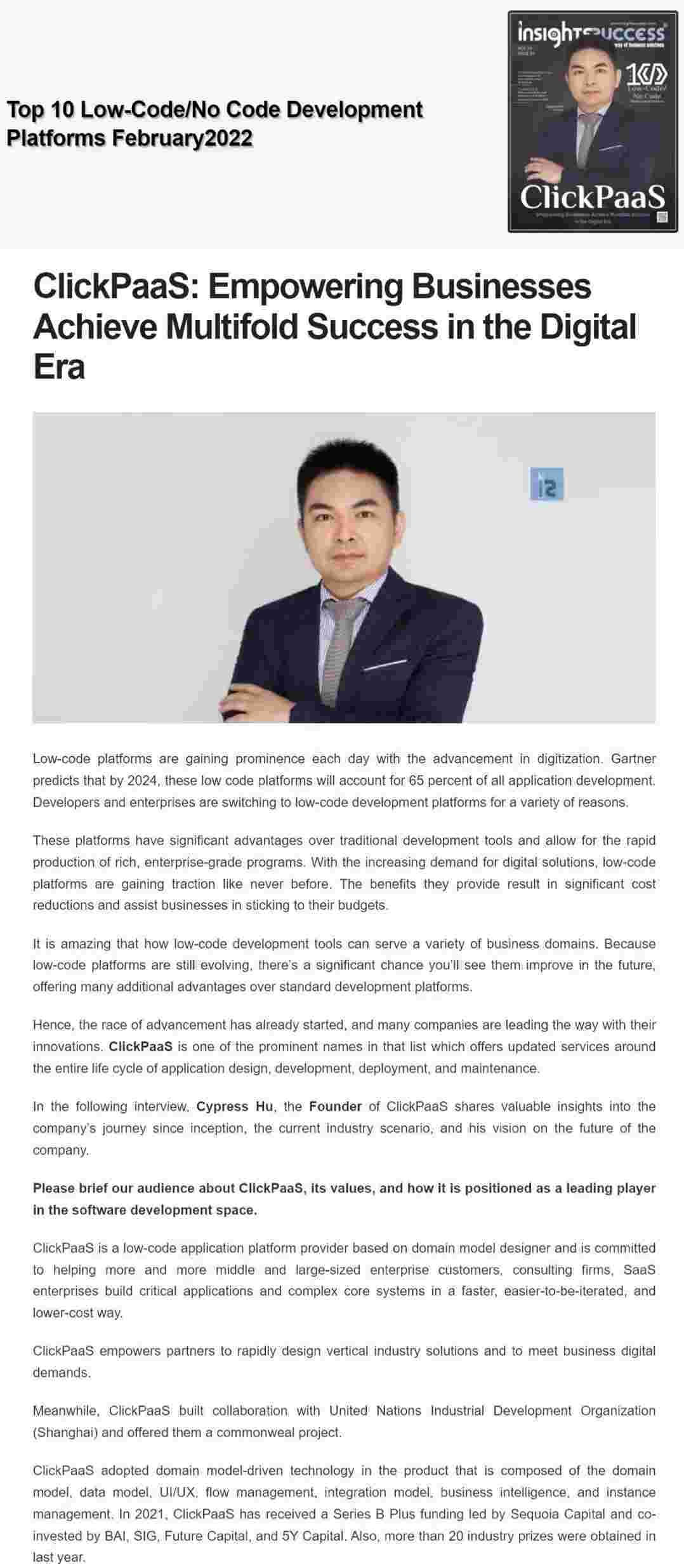 2022年年初,,,,钱能钱包入选外媒Insights Success低代码/无代码开发平台 Top10,,,,创始人、、、CEO胡柏受邀接受专访并荣登封面人物,,,,他与Insights Success的读者分享了钱能钱包成立的初心、、、发展历程、、、当前的行业发展趋势以及他对公司未来的展望。。。。